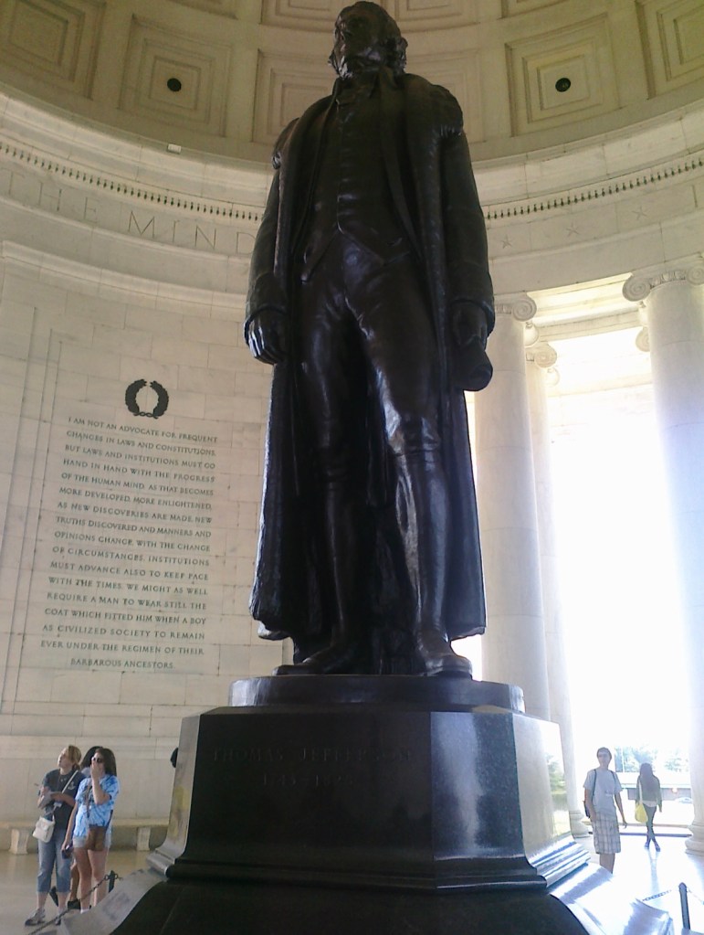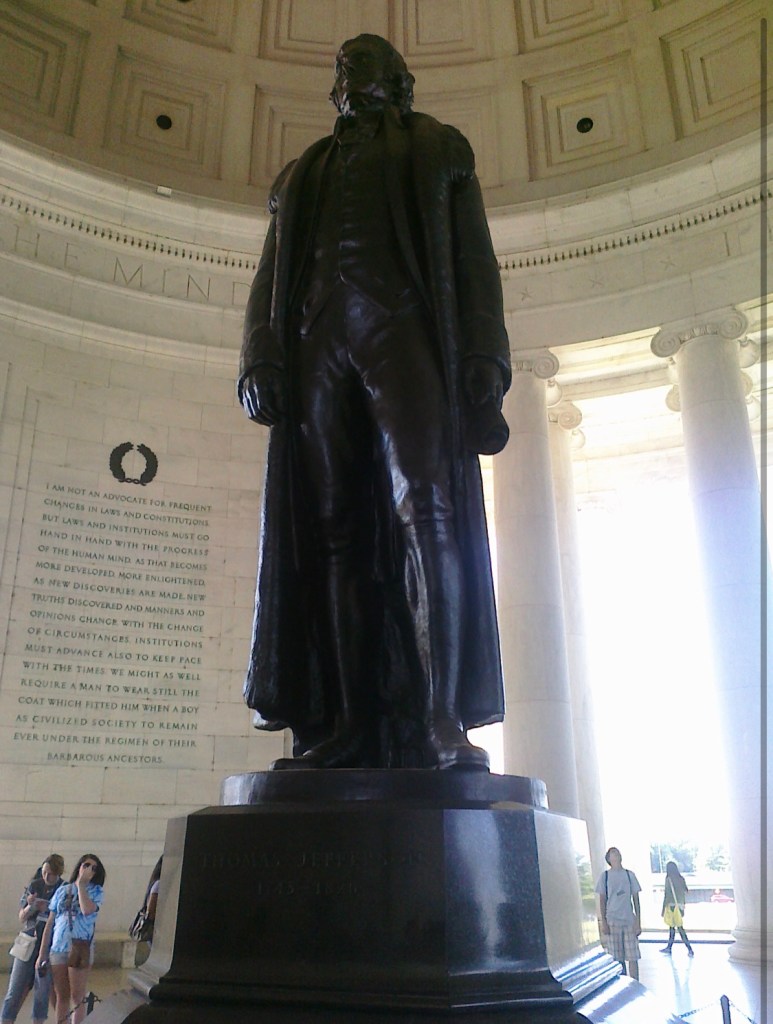 The sculpture above is the Statue of Jefferson by the sculptor Rudulph Evans. The statue is within the Jefferson Memorial in Washington D.C. and it’s a 19-foot (5.8 m) tall, 10,000 lb (4336 kg) bronze statue. The massive sculpture blends in very well with its surroundings since many of the statues in Washington D.C. are of such size and importance. The Jefferson Memorial was constructed from 1939-1943 but the statue was not. The statue was added in 1947. Below the dome are inscribed the words “I have sworn upon the altar of God eternal hostility against every form of tyranny over the mind of man.” The sentence comes from a letter that was written by Jefferson to Dr. Benjamin Rush in September 23, 1800. Within the letter is where Jefferson defends the constitutional refusal to recognize a state religion. This would be the subject of the sculpture and the writing expresses its purpose. The Jefferson sculpture is a full round sculpture. The Jefferson memorial is not perceived as too prominent in popular culture like several of the other monuments and buildings in Washington D.C. Might be due to its location and distance from other important sights. There’s many important ceremonies and events that are hosted each year at the Jefferson memorial. A few being the Easter Sunrise Service, the annual National Cherry Blossom Festival and memorial exercises. The monument is on the shore of the Potomac River, Tidal Basin and it’s surrounded by Japanese cherry trees that were a gift from the people of Japan in 1912. The annual National Cherry Blossom Festival must appreciate that very much. Besides the monument being aesthetically perfect, the surrounding of the shore and Japanese cherry trees gives it quite the view. The colors of the monument and the statue gives it a feel of its time and importance of the meaning behind its intent. The monument couldn’t have been placed in a better community where many historical events commemorated and sculpted to its perfection. Within the monument are the excerpts from the Declaration of Independence, written in 1776. The experience and feeling of being in such monument was one of a kind.